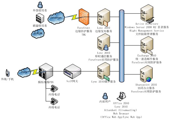 體驗(yàn)中心底層采用了基于Windows Server 2008 R2作為操作系統(tǒng)平臺(tái),并以此構(gòu)建全新的活動(dòng)目錄服務(wù)及文檔權(quán)限管理服務(wù),在操作系統(tǒng)平臺(tái)上搭建了包括Exchange Server 2010、Lync Server 2010、Sharepoint 2010在內(nèi)的完整商業(yè)辦公平臺(tái)應(yīng)用,并將以太網(wǎng)通過VoIP語音網(wǎng)關(guān)與傳統(tǒng)的模擬電話程控交換機(jī)相連接,提供了將電話、郵件(包括語音郵件)、日歷、視頻會(huì)議、即時(shí)消息、文檔即時(shí)協(xié)作等應(yīng)用直接關(guān)聯(lián)起來,帶來了前所未有的辦公體驗(yàn)。